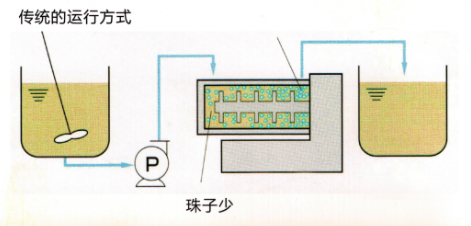 傳統(tǒng)磨機的運行方式 1、粒度難以控制,分散不充分; 2、粒度分布往往較寬; 3、無法控制物料的溫度; 4、在大流量高速運轉時,磨介易聚集在腔體一側,容易堵塞在出料口。 |